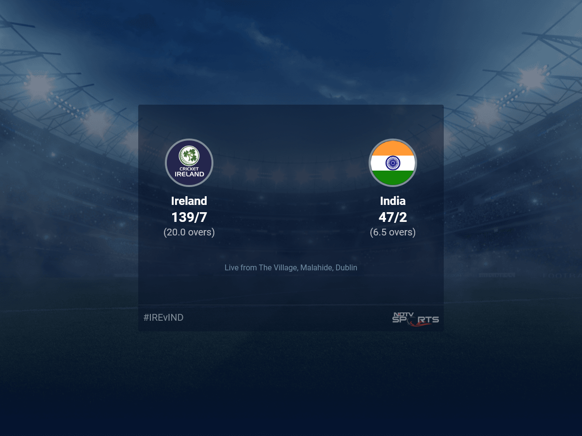 Follow the Ireland vs India, 2023 live cricket score on Sports.NDTV.com. After 6.5 overs, India, chasing a target of 140, are 47/2. Get live score, ball by ball commentary and much more. Keep track of Ireland vs India, 2023 today match between Ireland and India. Everything related to Ireland and India match will be available on Sports.NDTV.com. Stay updated with Ireland vs India live score. Do check for Ireland vs India scorecard. You can get scorecard updates, match related facts. Get quick live updates with ads, Sports.NDTV.com, which is the perfect destination for live cricket score.