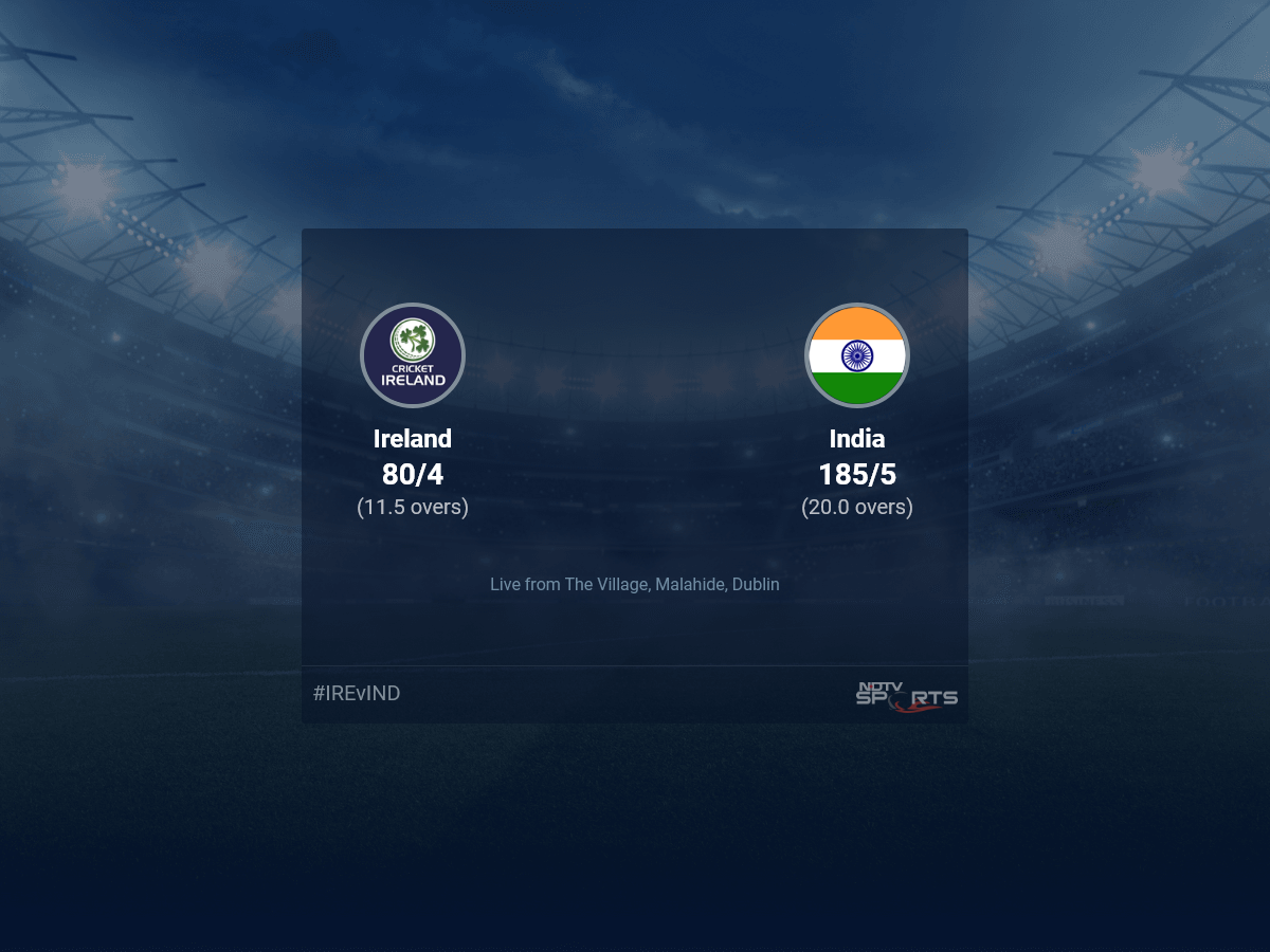 A dedicated team of experts bring you live score, live cricket score, live match update on Sports.NDTV.com. After 11.5 overs, Ireland, chasing a target of 186, are 80/4. The live updates of Ireland vs India scorecard is also available. It is the perfect platform to follow your favourite teams in Ireland vs India, 2023. Keep a track on your favourite batsmen and bowlers through Ireland vs India, 2023 today match, ball by ball commentary, Ireland vs India, Ireland vs India live score, Ireland vs India scorecard. Follow the excitement of the Ireland vs India, 2023 on Sports.NDTV.com as you can follow live match updates and live cricket score through our platform.